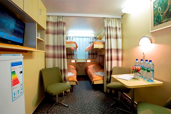 Четырехместная двухъярусная каюта со всеми удобствами, расположенная на нижней палубе. Площадь каюты ≈ 12,8 м². В каюте: четыре спальных места (два внизу, два вторым ярусом), шкаф для одежды, холодильник, телевизор, фен, радио, ванная комната (раковина, душ, туалет), кондиционер, розетка 220V, два иллюминатора.