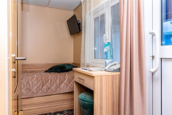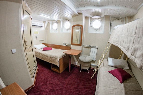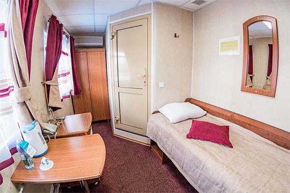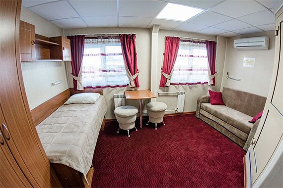 Во всех каютах на теплоходе есть: санузел со встроенными душевыми кабинами, кондиционер, холодильник, телефон, телевизор со спутниковым приемом телеканалов, удобная мебель.