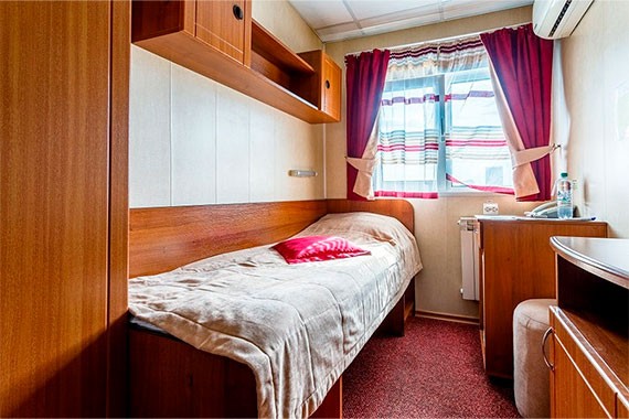 К категории А1(II) относятся каюты: 301, 302. Одноместная каюта со всеми удобствами, расположенная на средней палубе. Площадь каюты ≈ 5,6 м². В каюте: односпальная кровать, шкаф, тумба, пуф, стол, настенная полка, телевизор с кабельным и спутниковым вещанием, холодильник, ванная комната (раковина, душ, туалет), кондиционер, телефон внутренней связи, фен, радио, плед, розетки 220 V, щетка для одежды, обзорное окно.