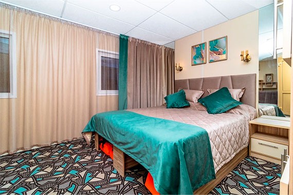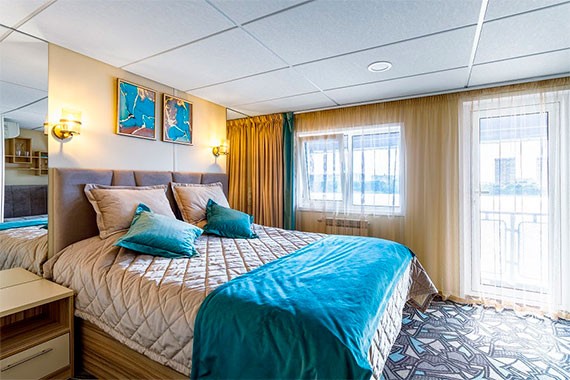Люкс – двухместная двухкомнатная каюта увеличенной площади со всеми удобствами, расположенная на средней палубе. Площадь каюты ≈ 21 м². В каюте: двуспальная кровать и двуспальный диван, шкаф, прикроватные тумбы, комод, туалетный стол, пуф, журнальный стол, вешалка для верхней одежды, телевизор с кабельным и спутниковым вещанием, холодильник, ванная комната (раковина, душевая кабина, туалет), сейф, кондиционер, телефон внутренней связи, розетки 220 V, фен, плед для каждого туриста, обзорные окна.